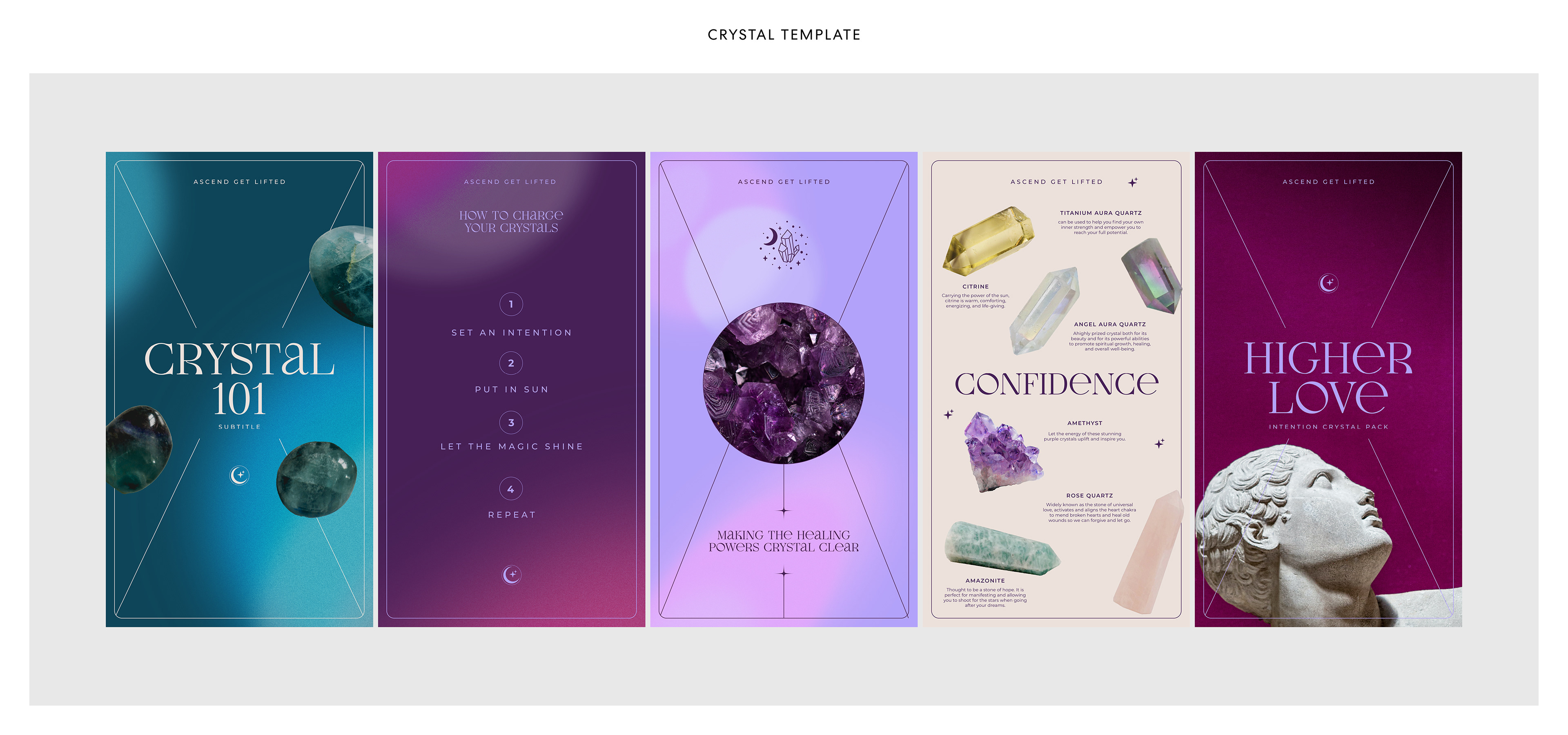 Nous avons été mandaté pour concevoir un guide de marque afin de renouveler l'image de la compagnie ASCEND Get Lifted, située à Salem, une boutique offrant cristaux, bijoux et services ésotériques. Pour ce projet, nous avons établi une nouvelle palette de couleurs, de nouveaux icônes, et avons créé plusieurs modèles de visuels pour les réseaux sociaux.